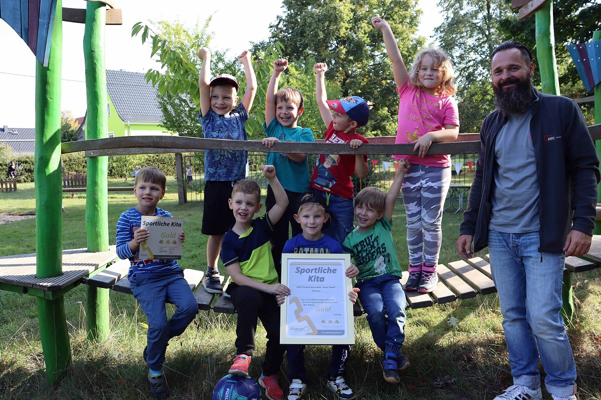 Bewegung ist im frühen Kindesalter das A und O, deshalb ist eine frühzeitige Gewöhnung daran ausschlaggebend für die kindliche Entwicklung. Landkreisweit engagieren sich dafür neben den Sportvereinen, auch Kindergärten in Form von Sport- und Bewegungsangeboten in den Einrichtungen selbst. Dieser Einsatz der Kitas wurde auch 2023 wieder belohnt: Die Zertifizierung zur „Sportlichen Kita“ ging in die zweite Runde. In diesem Jahr folgten 15 Kitas dem Aufruf des Kreissportbund Bautzen und ließen sich in den Kategorien Bronze, Silber und Gold auszeichnen. Hierbei müssen die Kitas definierte Kriterien erfüllen, darunter zählen beispielsweise das Sächsische Kindersportabzeichen „Flizzy“, die Teilnahme an der Sparkassen-Kreis-Kita-Olympiade und auch wöchentliche Sportangebote in der Einrichtung. Die Erzieher und Erzieherinnen werden motiviert, jährlich an lehrreichen und praxisnahen Bildungsangeboten des Kreissportbundes teilzunehmen, um so das neuerworbene Wissen an die Kinder spielerisch weiterzugeben. Jede zertifizierte Kita erhält eine Urkunde sowie eine große Plakette zur Außendarstellung an der Kitaeinrichtung. Ein hervorzuhebendes Beispiel ist die AWO Kita „Anne Frank“ aus Kamenz. Diese Einrichtung konnte innerhalb eines Jahres den Status von Silber auf Gold aufwerten. „Das Verfahren zur Zertifizierung ist komplett unkompliziert gelaufen und die Auszeichnung ist eine Wertschätzung für unsere pädagogische Arbeit“, so Ronny Eberhardt, stellvertretender Kitaleiter.