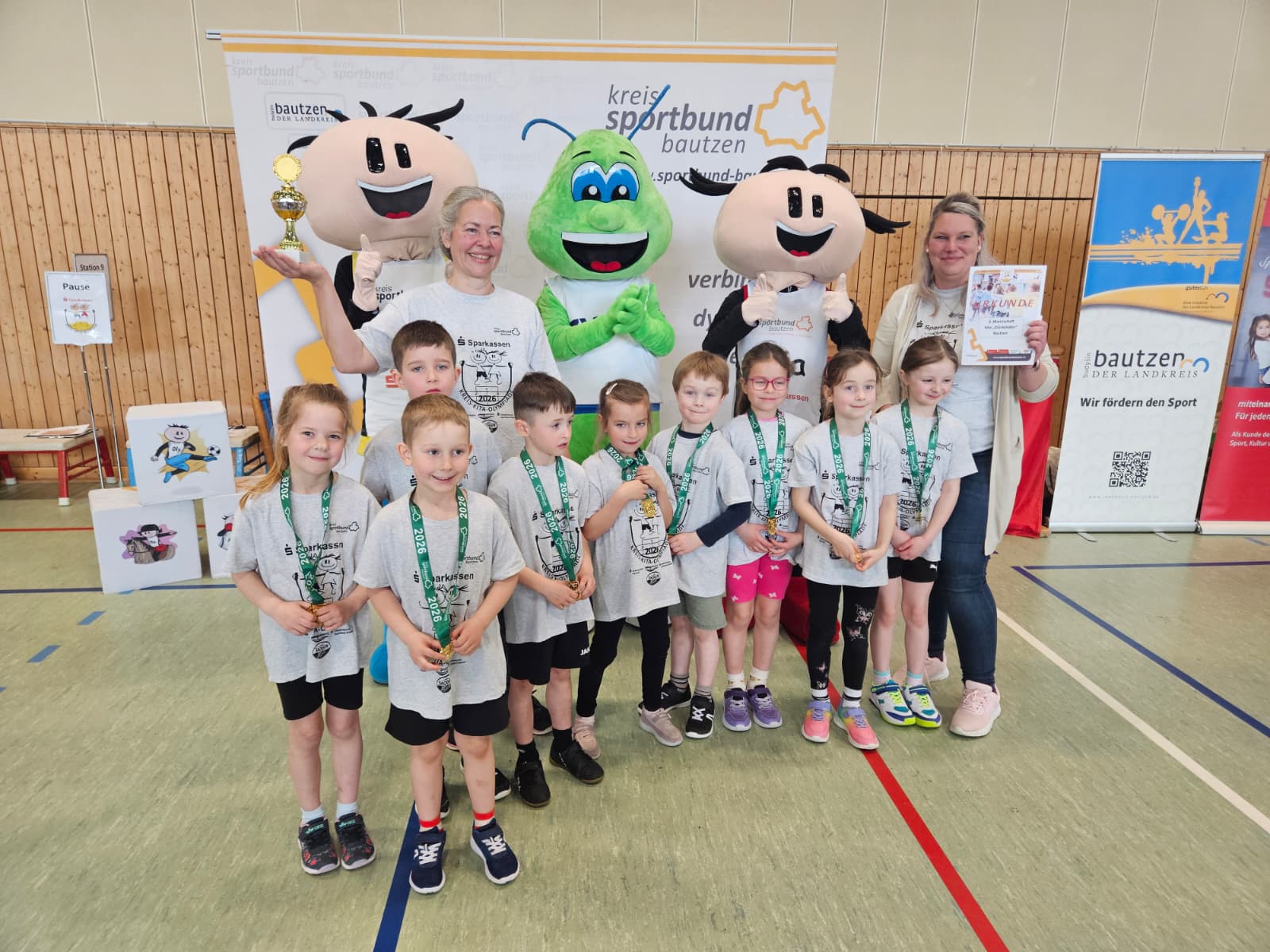 Alle feuerte sich gegenseitig an und auch die zahlreichen Zuschauer auf der Tribüne sorgten für ordentlich Lärm in der Schützenplatzhalle. Obligatorisch wird die Vorrunde mit der Abschlussstaffel beendet, welche dann die finalen Ergebnisse lieferte. Über den dritten Platz freute sich die Kita „Regenbogen“ aus Kubschütz. Die silberne Medaille erkämpfte sich die AWO Kita „Knirpsenland“ aus Bautzen. Die Goldmedaille und damit auch den Vorrundenpokal sicherte sich das dritte Team der Kita „Glückskäfer“ aus Bautzen. Nicht nur den Vorrundensieg holte sie sich heute, sondern wurden gleichzeitig auch zur „Sportlichen Kita“ in Gold ausgezeichnet. Damit sind die „Glückskäfer“ die 50. Kita im Landkreis, welche sich offiziell als zertifizierte sportliche Einrichtung nennen darf.