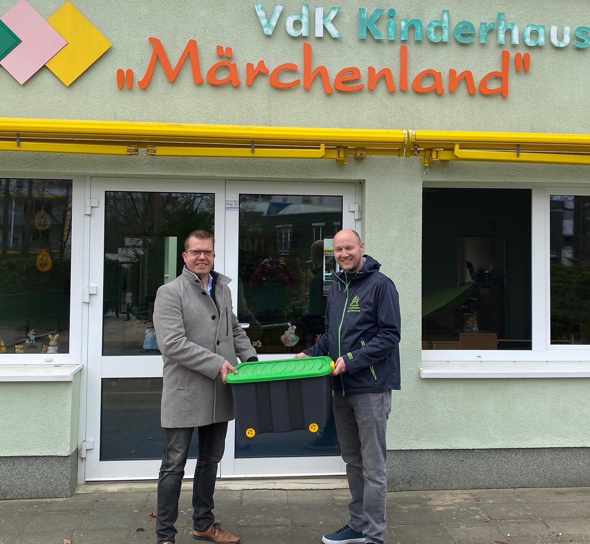Bildunterschrift: VdK Sachsen-Geschäftsführer Ralph Beckert (links im Bild) und Kitaleiter John Paulusch bei der Entgegennahme der Flizzy Bewegungskiste des Kreissportbundes Bautzen.