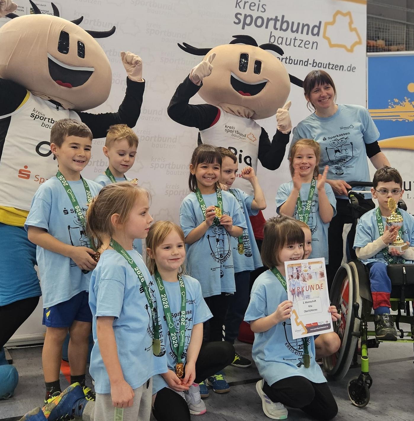 Mit großer Begeisterung startete am 24. Februar die diesjährige Sparkassen Kreis-Kita-Olympiade des Kreissportbund Bautzen und knüpft dabei an die Faszination der Olympischen Winterspiele in Italien an. Anstatt des olympischen Feuers eröffneten die Maskottchen Oly und Pia mit kleinen Konfettikanonen symbolisch die erste Vorrunde der unter Erzieher herzlich genannten Knirpsenolympiade. Zum Auftakt nahmen zwölf Kitas mit 18 Teams aus dem Umkreis von Pulsnitz teil. Nach der kurzen Erwärmung begannen die abwechslungsreichen Sportstationen, die mit einer Abschlussstaffel abgerundet wurden. Mit viel Freude und Teamgeist bestritten die Teams die sportlichen Herausforderungen und waren gespannt, wer den Vorrundenpokal mit in die Kita nehmen kann. Die Bronzemedaille erkämpfte sich die AWO Kita „Weberschiffchen“ aus Großröhrsdorf. Silber ging an die AWO Kita „Bummiland“ aus Großröhrsdorf und über Gold freute sich das zweite Team der Kita aus Oberlichtenau. Alle drei Teams qualifizieren sich damit für das Finale am 15. April in Kamenz.
