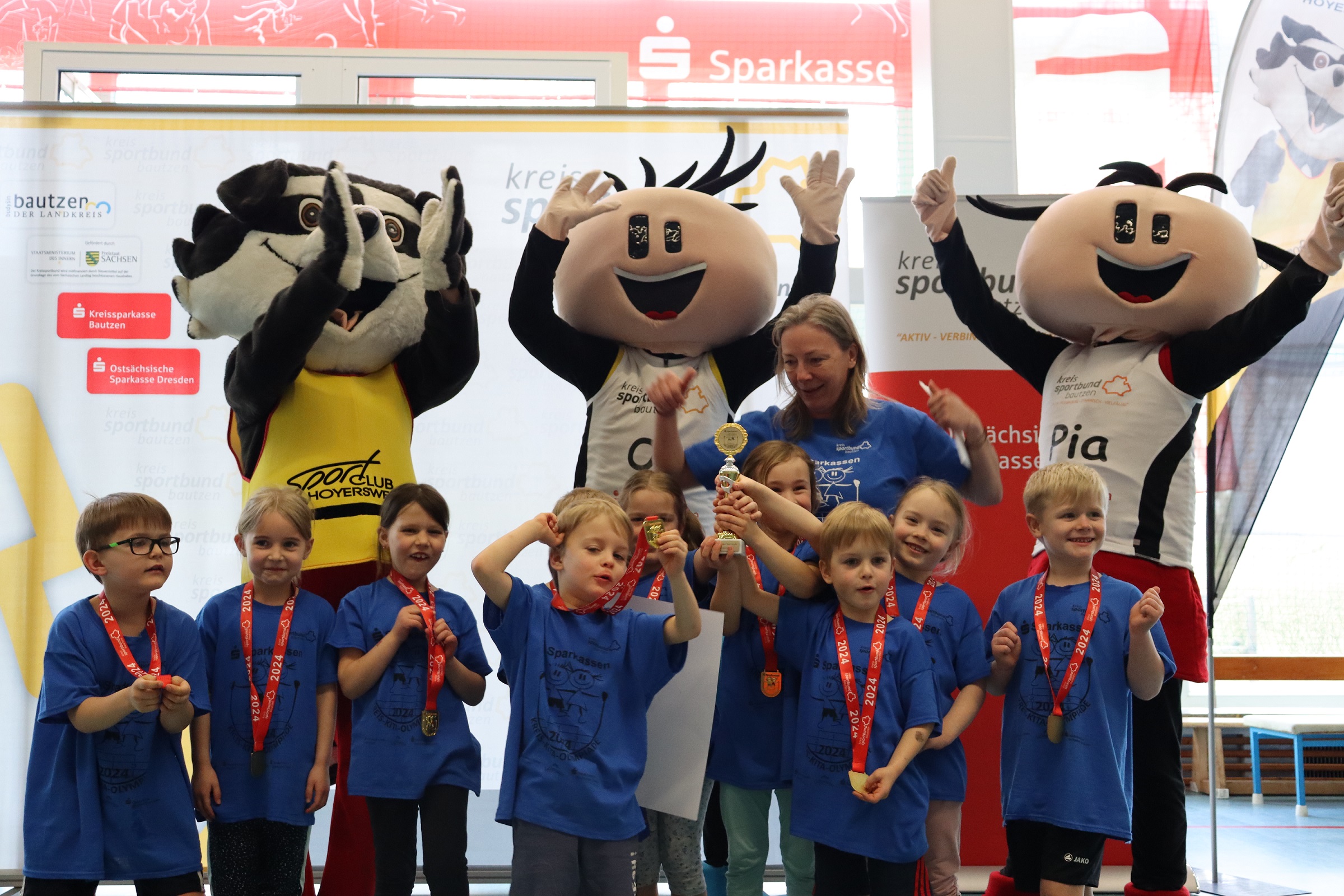 Der Oberbürgermeister Torsten Ruban-Zeh, die Vertreterin der Ostsächsischen Sparkassen Dresden Frau Nicole Klitzke sowie SC Hoyerswerda Geschäftsführerin Daniela Fünfstück begrüßten die Kinder. Insgesamt 22 Mannschaften aus dem Umkreis kämpften um den begehrten Vorrundenpokal sowie den Einzug in das Finale. Die kleinen Sportlerinnen und Sportler freuten sich besonders auf das gemeinsame Sporttreiben und das Erleben eines solchen Highlights. Oly und Pia zauberten den ca. 230 Kindern ein Lächeln ins Gesicht, welches den ganzen Vormittag anhielt. Besonders viel Spaß bereitete den Kindern das Rollbrettfahren, der Klammerkönig und der Hindernislauf. Ein großes Dankeschön geht an die Schülerinnen und Schüler der BMS Hoyerswerda, die einen fairen Stationsbetrieb gewährleistet haben. Unter großem Applaus erhielt jede Kita ihre Urkunde und jedes Kind eine Medaille.