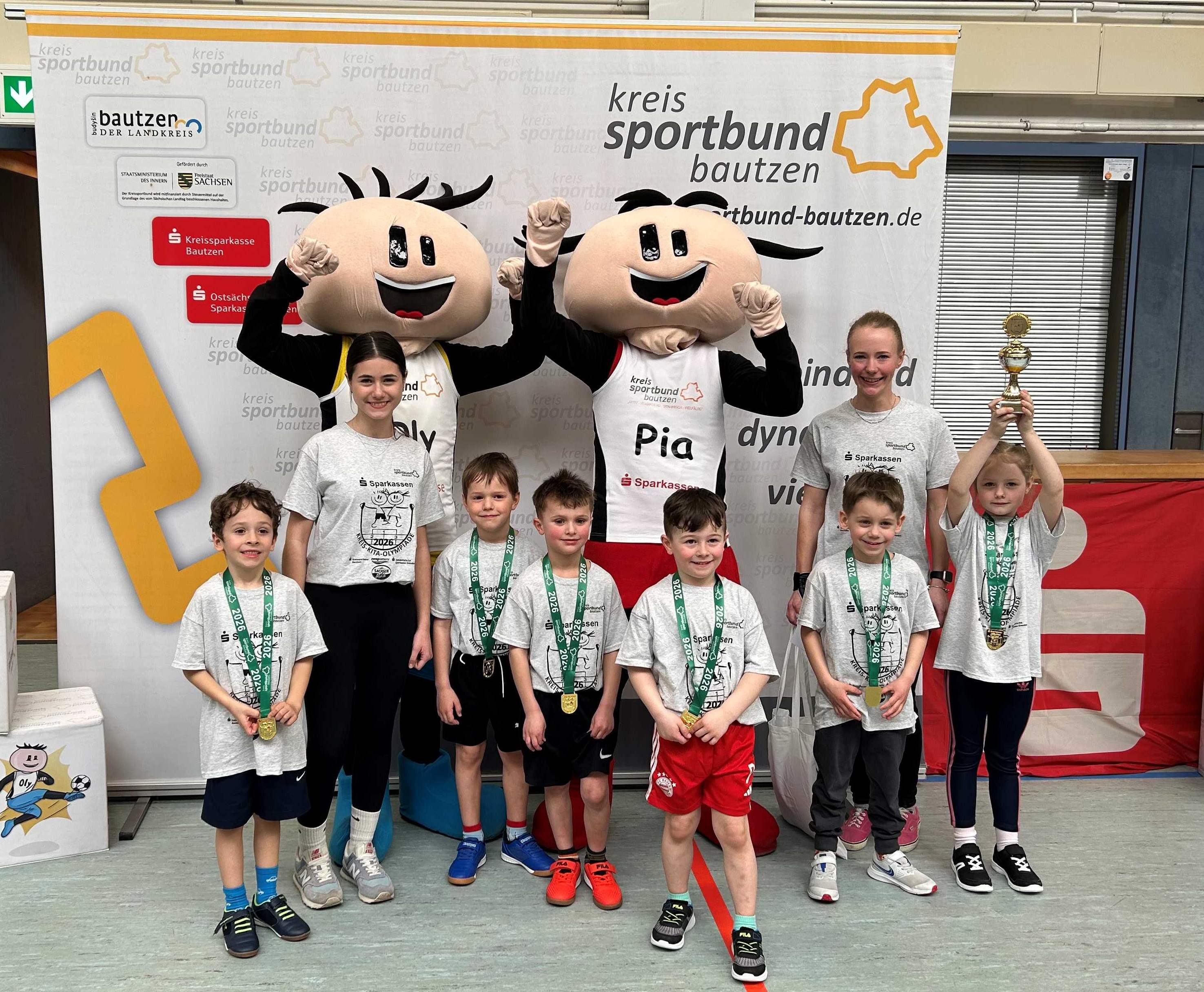 Mit viel Bewegung und guter Laune fand die Vorrunde der Sparkassen Kreis-Kita-Olympiade in der Oberlandturnhalle in Sohland statt. Insgesamt 13 Kindertagesstätten mit 21 Teams gingen an den Start. Eröffnet wurde die Veranstaltung feierlich durch den Bürgermeister Hagen Israel, der sich nicht nur mit motivierenden Worten an die jungen Sportlerinnen und Sportler wandte, sondern auch aktiv an der gemeinsamen Erwärmung teilnahm. Nach spannenden Wettbewerben konnte sich am Ende die AWO Kita „Pumuckl“ aus Weigsdorf-Köblitz den ersten Platz sichern. Damit feiert das Team bereits den zweiten Vorrundensieg in Folge. Den zweiten Platz belegte das 1. Team der Kita „Wichtelland“ aus Cunewalde, während sich die DRK Kita „Spatzenhaus“ aus Wilthen den dritten Platz erkämpfte. Alle drei Teams haben sich damit für das Finale der Sparkassen Kreis-Kita-Olympiade qualifiziert und dürfen dort erneut ihr sportliches Können unter Beweis stellen. Neben den sportlichen Wettkämpfen stand eine Kita besonders im Fokus: Mit ihrer ersten Teilnahme an der Kita-Olympiade wurden nun alle Kriterien zur Zertifizierung „Sportlichen Kita“ in Gold erfüllt. Über diese Auszeichnung kann sich nun die DRK Kita „Zur kleinen Feuerwehr“ aus Neukrich/Lausitz freuen.