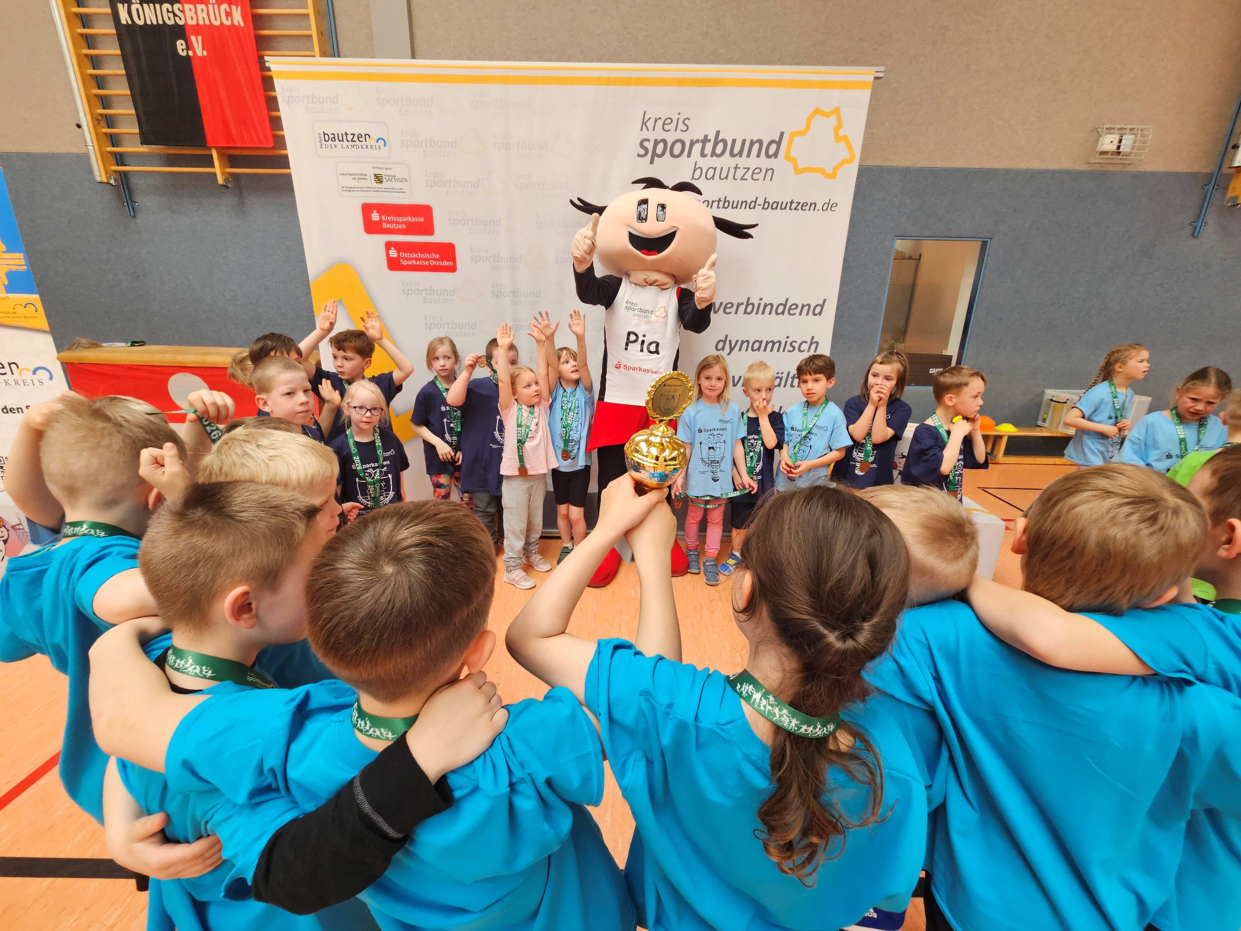 Bei einer etwas kleineren Vorrunde mit 13 Teams wurden heute in Königsbrück die nächsten Finalisten gesucht. Mit viel Freude und Begeisterung erwärmten sich die Kids mit unserem Maskottchen „Pia“. Geprägt von Fairness und viel Ehrgeiz wurden die neun Stationen mit der herausfordernden Überraschungsstation absolviert. Bereits da stand schon der Vorrundensieger fest, da die Punkte nicht mehr einzuholen waren. Dennoch kämpften die Teams bei der Abschlussstaffel um das zweite Finalticket. Nun stand die Siegerehrung auf dem Programm und alle warteten gespannt auf die Ergebnisse. Jede Kind bekam eine Medaille u.a. überreicht vom Bürgermeister Heiko Driesnack. Auf dem dritten und zweiten Platz schaffte es die Kita „Regenbogen“, welche nur wenige Meter von der Sportstätte entfernt den wohl kürzesten Anreiseweg hatte. Hingegen schon etwas früher aufgestanden und als Erstes die Halle betrat der Vorrundensieger – der Waldkindergarten aus Ottendorf-Okrilla. Damit sind die beiden Teams nun die Finalisten 15 und 16.